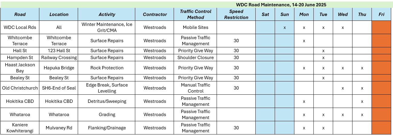Forecast road maintenance for the week of Monday, 9 June - Friday, 13 June. Click the image to view in full.